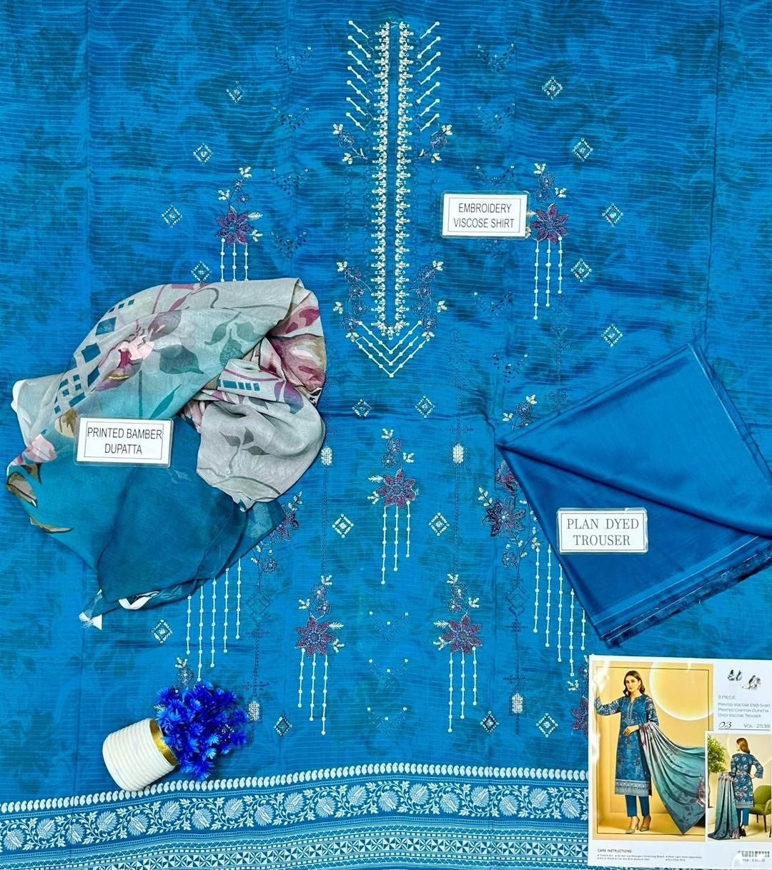 • Shirt Fabric: Viscose• Pattern: Embroidered• Shirt Front Pattern: Embroidered• Sleeves Pattern: Printed• Shirt Back Pattern: Printed• Trouser Fabric: Viscose• Trouser Pattern: Plain• Dupatta Fabric: Bamber• Dupatta Pattern: Printed• Number Of Pieces: 3 Pcs• Color: Blue• Package Includes: 1 x Shirt, 1 x Trouser, 1 x Dupatta• Shirt Cutting: 3.0 Meter• Trouser Cutting: 2.5 Meter• Dupatta Cutting: 2.5 Meter• Color: Blue• Note: There might be an error of 1-3 cm due to manual measurement, and slight color differences may occur as a result of varying lighting and monitor effects.
