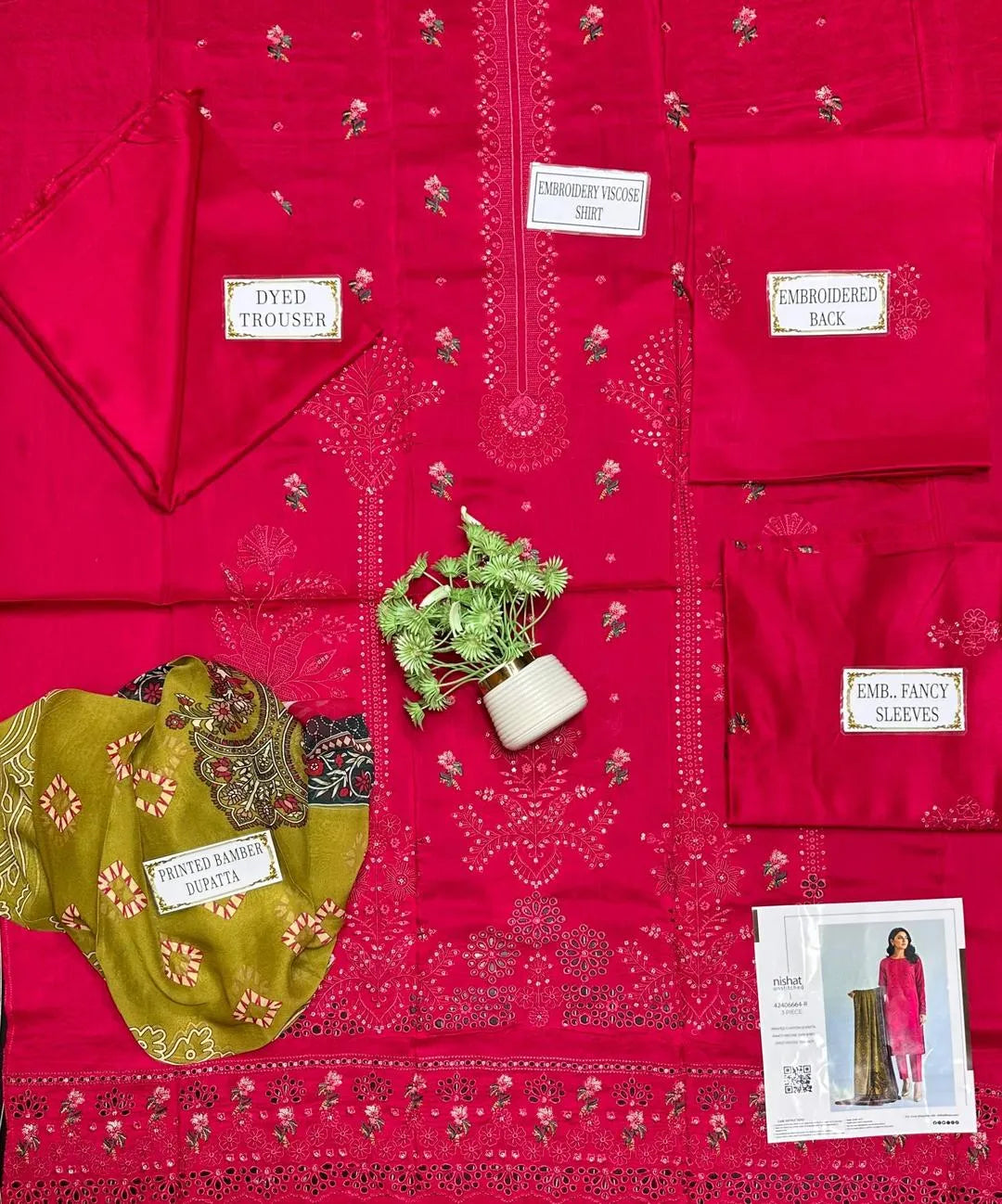 • Shirt Fabric: Viscose• Pattern: Plain• Shirt Front Pattern: Embroidered• Neckline: Embroidered• Sleeves Pattern: Embroidered• Daman: Embroidered• Shirt Back Pattern: Embroidered• Trouser Fabric: Viscose• Trouser Pattern: Plain• Dupatta Fabric: Bamber• Dupatta Pattern: Printed• Number Of Pieces: 3 Pcs• Package Includes: 1 x Shirt, 1 x Trouser, 1 x Dupatta• Shirt Cutting: 3.0 Meter• Trouser Cutting: 2.5 Meter• Dupatta Cutting: 2.5 Meter• Color: Pink