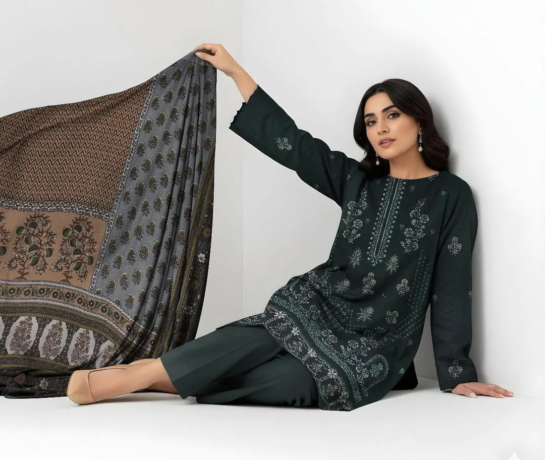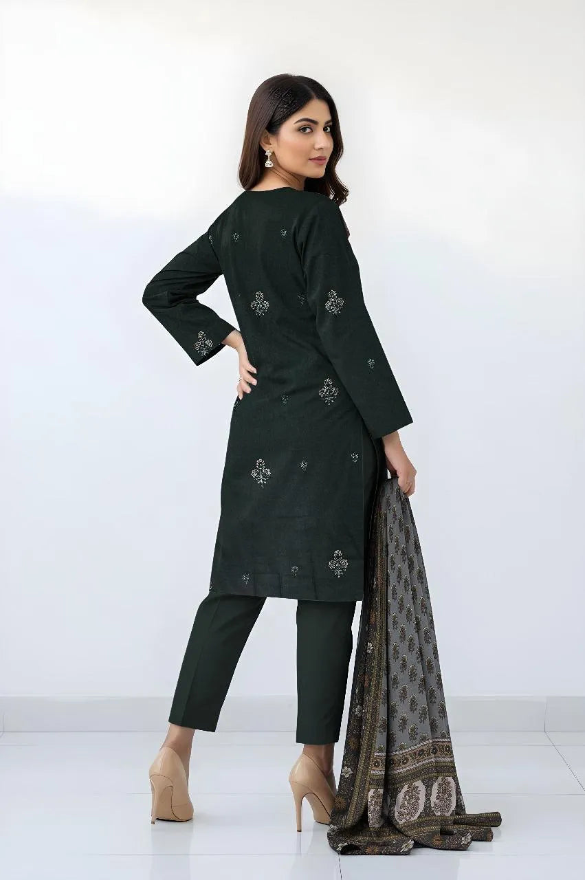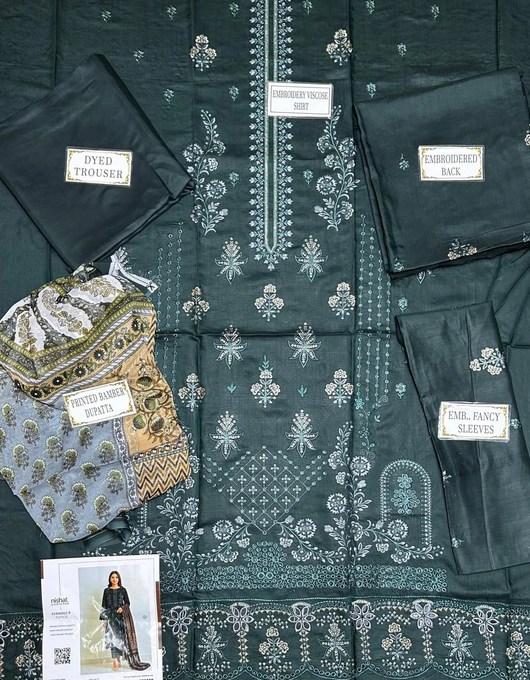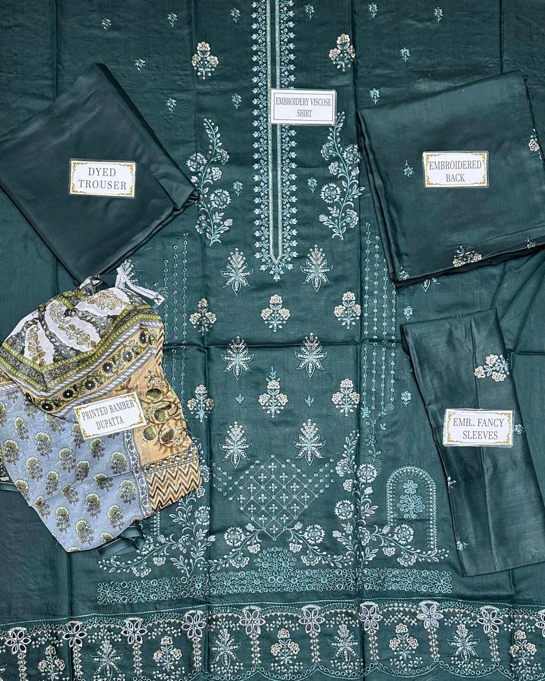• Shirt Fabric: Viscose• Pattern: Plain• Shirt Front Pattern: Embroidered• Neckline: Embroidered• Sleeves Pattern: Embroidered• Daman: Embroidered• Shirt Back Pattern: Embroidered• Trouser Fabric: Viscose• Trouser Pattern: Plain• Dupatta Fabric: Bamber• Dupatta Pattern: Printed• Number Of Pieces: 3 Pcs• Package Includes: 1 x Shirt, 1 x Trouser, 1 x Dupatta• Shirt Cutting: 3.0 Meter• Trouser Cutting: 2.5 Meter• Dupatta Cutting: 2.5 Meter• Color: Green