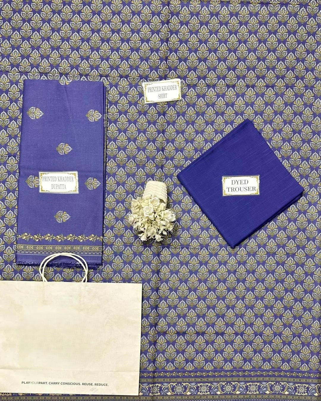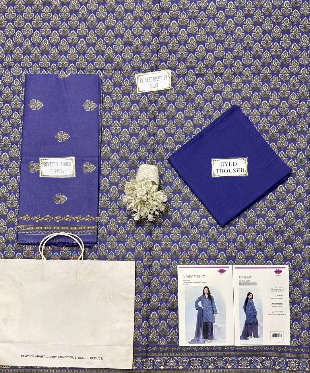 • Shirt Fabric: Khaddar• Pattern: Printed• Sleeves Pattern: Printed• Shirt Back Pattern: Printed• Trouser Fabric: Khaddar• Trouser Pattern: Plain• Dupatta Fabric: Khaddar• Dupatta Pattern: Printed• Number Of Pieces: 3 Pcs• Package Includes: 1 x Shirt, 1 x Trouser, 1 x Dupatta• Shirt Cutting: 3.0 Meter• Trouser Cutting: 2.5 Meter• Dupatta Cutting: 2.5 Meter• Color: Blue•
