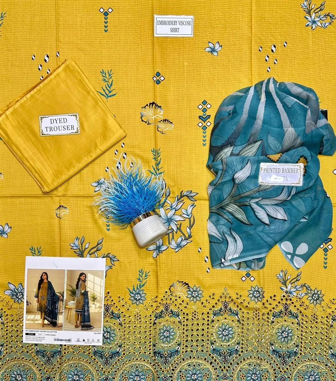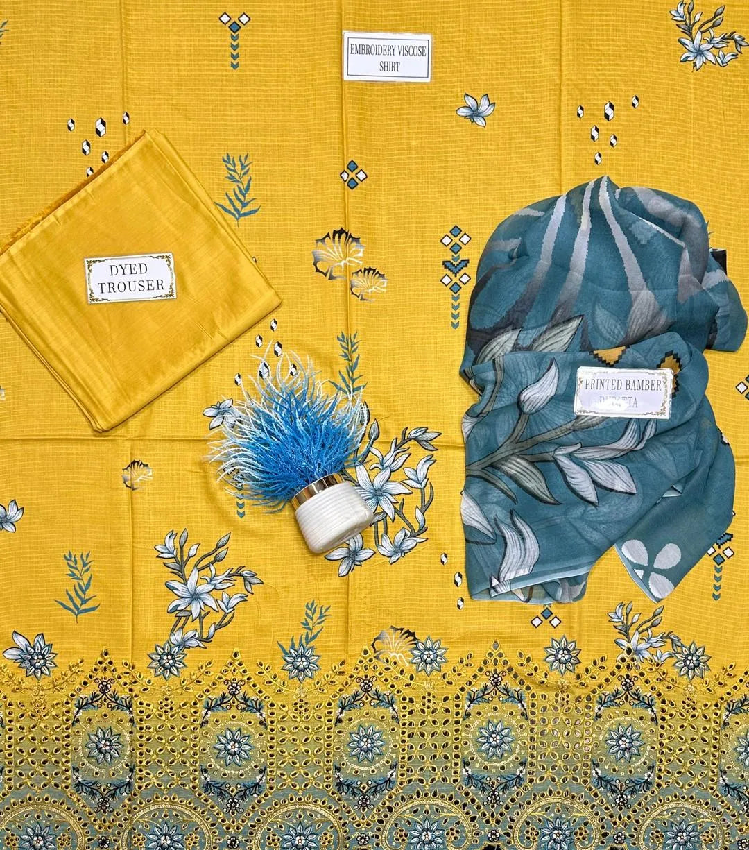 • Shirt Fabric: Viscose• Pattern: Printed• Shirt Front Pattern: Embroidered• Sleeves Pattern: Printed• Daman: Embroidered• Shirt Back Pattern: Printed• Trouser Fabric: Viscose• Trouser Pattern: Plain• Dupatta Fabric: Bamber• Dupatta Pattern: Printed• Number Of Pieces: 3 Pcs• Package Includes: 1 x Shirt, 1 x Trouser, 1 x Dupatta• Shirt Cutting: 3.0 Meter• Trouser Cutting: 2.5 Meter• Dupatta Cutting: 2.5 Meter• Color: Golden