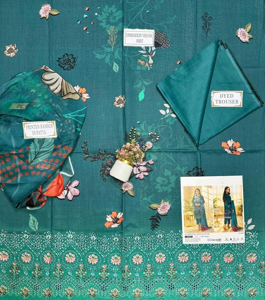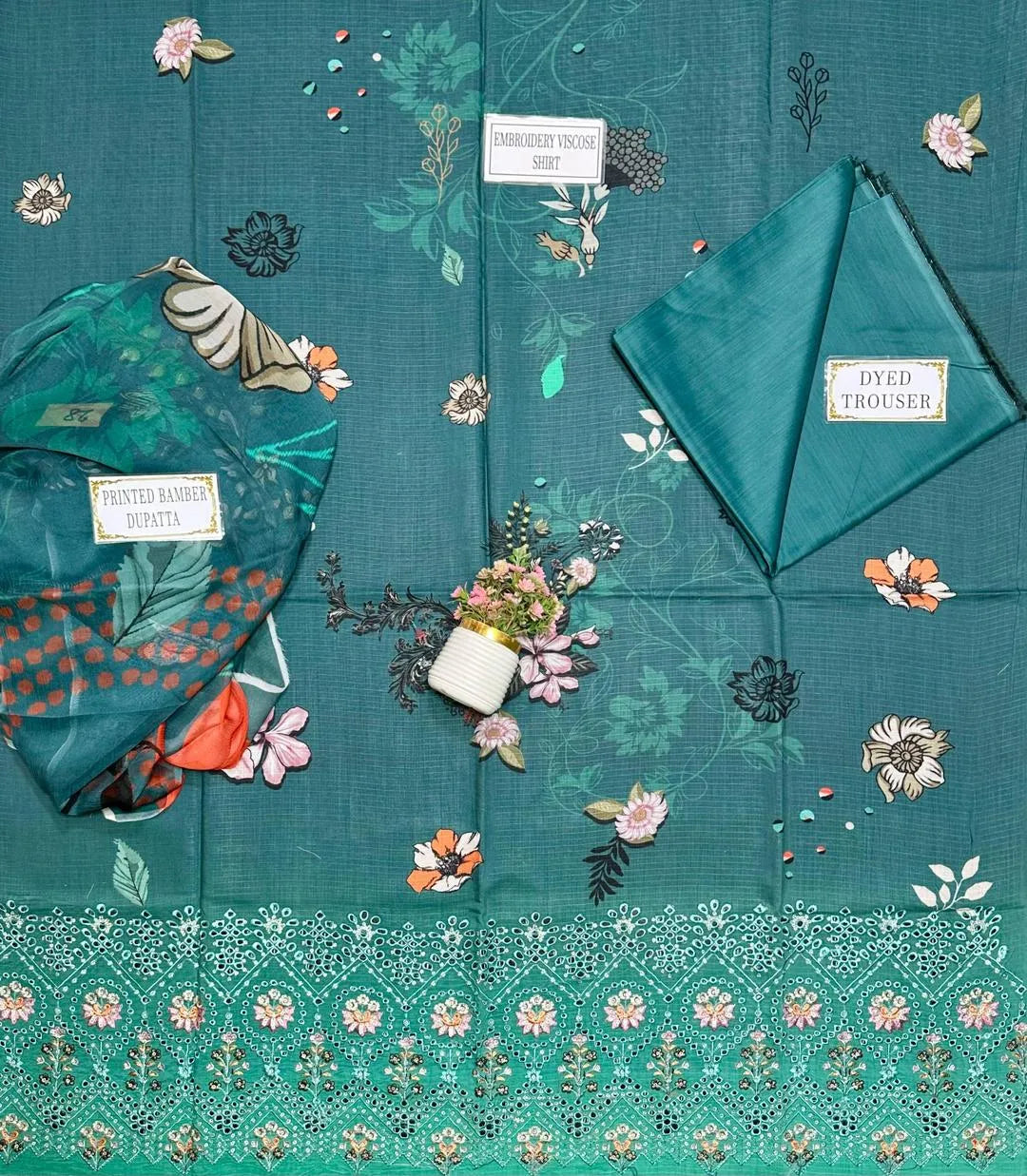 • Shirt Fabric: Viscose• Pattern: Printed• Shirt Front Pattern: Embroidered• Sleeves Pattern: Printed• Daman: Embroidered• Shirt Back Pattern: Printed• Trouser Fabric: Viscose• Trouser Pattern: Plain• Dupatta Fabric: Bamber• Dupatta Pattern: Printed• Number Of Pieces: 3 Pcs• Package Includes: 1 x Shirt, 1 x Trouser, 1 x Dupatta• Shirt Cutting: 3.0 Meter• Trouser Cutting: 2.5 Meter• Dupatta Cutting: 2.5 Meter• Color: Blue